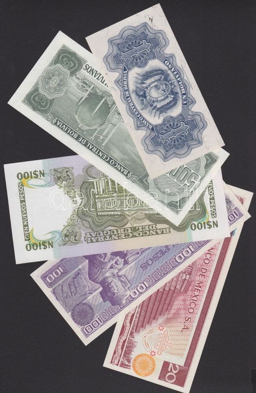 Leírás: Bolívia 1952. 1B + 1984. 50.000B + Uruguay 1987. 100P + Mexikó 1977. 20P + 1982. 100P T:I