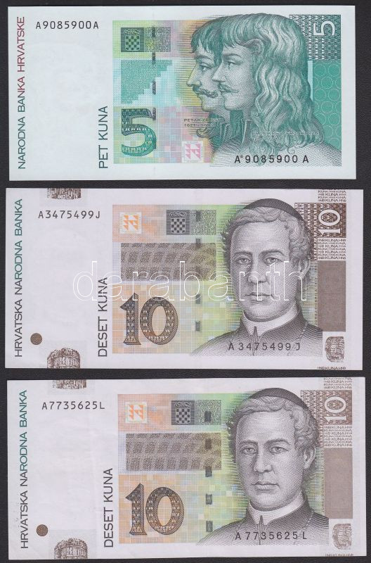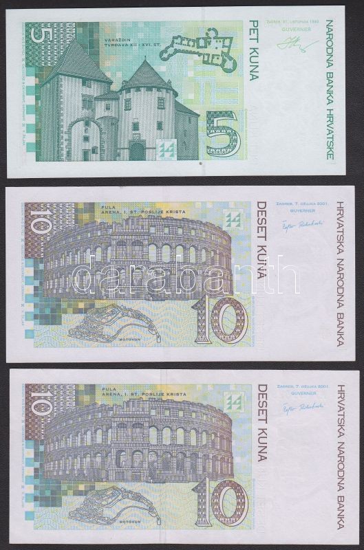 Horvátország 1993. 5K T:I + 2001. 10K (2x) T.I,II https://www.darabanth.com/hu/140-Gyorsarveres/140.0/Numizmatika/Kulfoldi-bankjegyek~10012/Horvatorszag-1993-5K-TI-plus-2001-10K-2x-TI-II~II413221