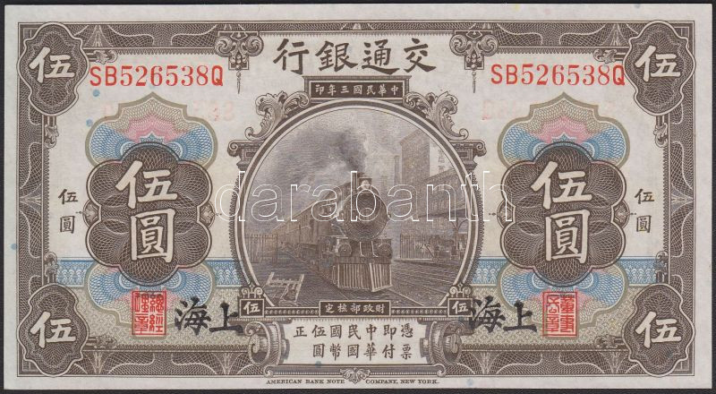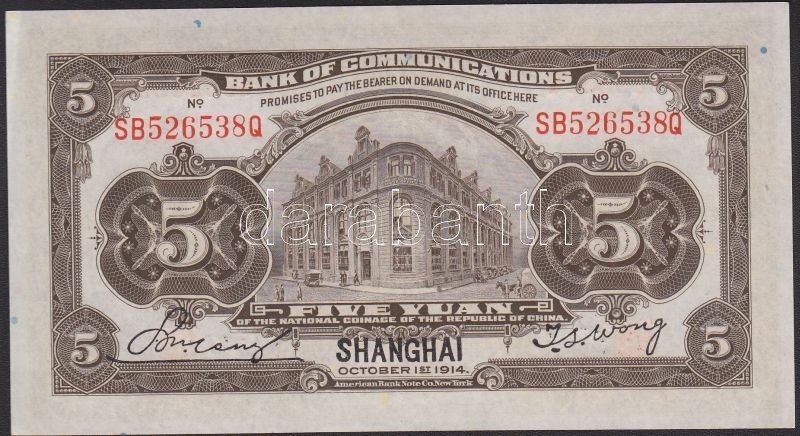 Kínai Köztársaság 1914. 5Y fekete "SHANGHAI" fny. T:I https://www.darabanth.com/hu/140-Gyorsarveres/140.0/Numizmatika/Kulfoldi-bankjegyek~10012/Kinai-Koztarsasag-1914-5Y-fekete-SHANGHAI-fny-TI~II413244