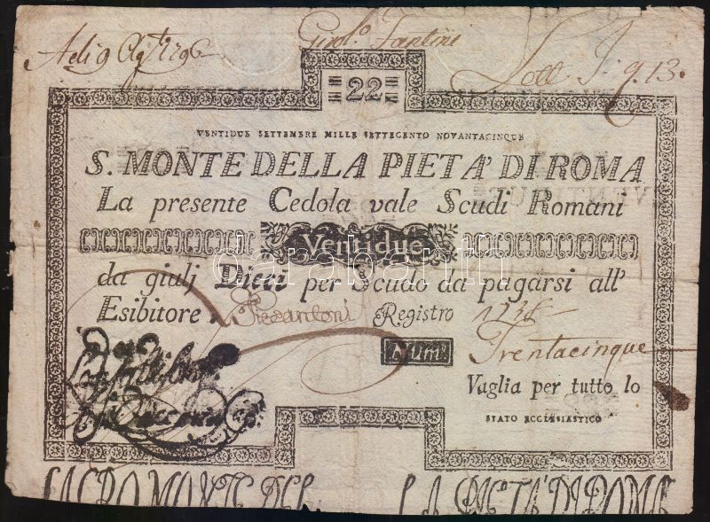 Leírás: Olasz Államok / Római tartomány 1748. 22 Scudi "S. Monte Della Pieta Di Roma" vízjellel! T:III RR! hajtásoknál kis hiányosságok