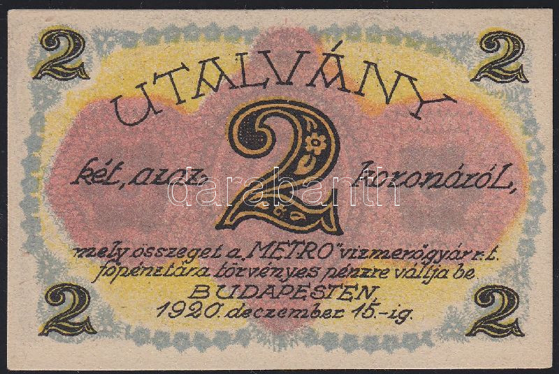 Leírás: Budapest / Metro Vízmérőgyár Rt. 1920. 2K utalványa T:I