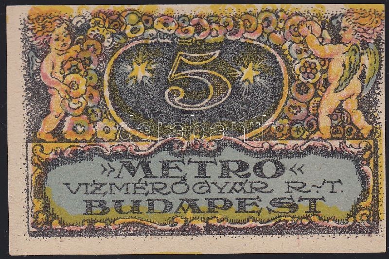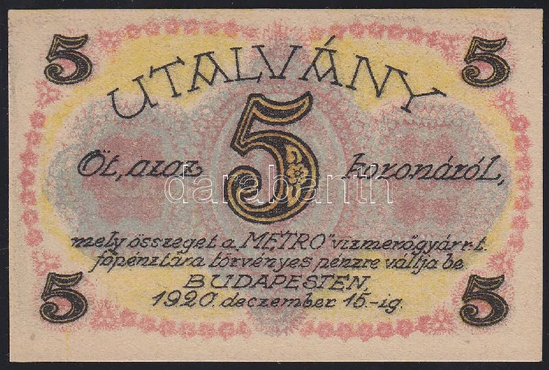 Leírás: Budapest / Metro Vízmérőgyár Rt. 1920. 5K utalványa T:I