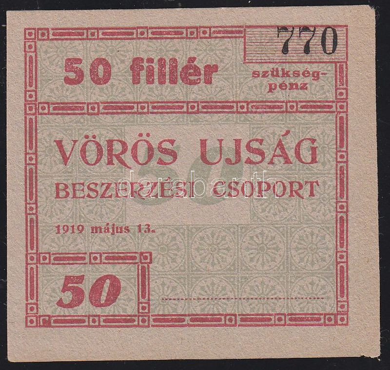Budapest / Vörös Újság 1919. 50f T:I https://www.darabanth.com/hu/140-Gyorsarveres/140.0/Numizmatika/Magyar-es-kulfoldi-papir-es-fem-szuksegpenzek-penzhelyettesitok-~10007/Budapest-Voros-Ujsag-1919-50f-TI~II411530