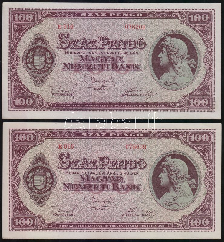 1945. 100P (2x) egymásutáni sorszámmal! T:I- https://www.darabanth.com/hu/140-Gyorsarveres/140.0/Numizmatika/Magyar-es-magyar-vonatkozasu-bankjegyek~10008/1945-100P-2x-egymasutani-sorszammal-TI-~II412755