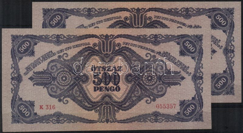 1945. 500P (2x) egymásutáni sorszámmal T:I https://www.darabanth.com/hu/140-Gyorsarveres/140.0/Numizmatika/Magyar-es-magyar-vonatkozasu-bankjegyek~10008/1945-500P-2x-egymasutani-sorszammal-TI~II357640