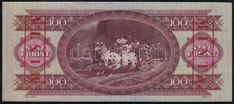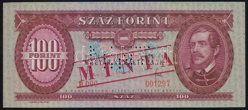 Leírás: 1968. 100Ft "MINTA" perforációval és felülnyomással "B 000" sorozatszámmal T:I