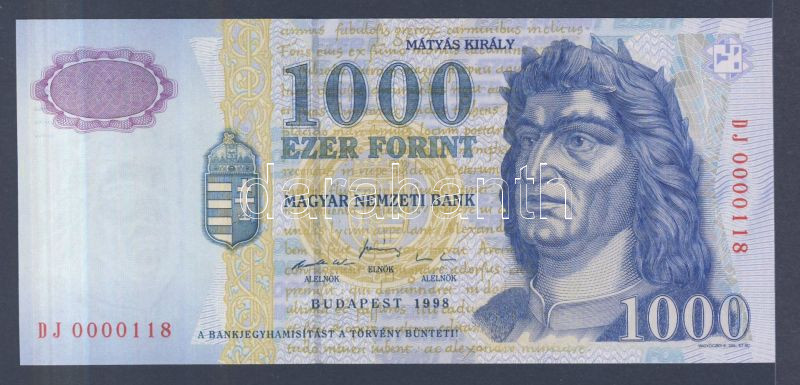 1998. 1000Ft "DJ" széria T:I https://www.darabanth.com/hu/140-Gyorsarveres/140.0/Numizmatika/Magyar-es-magyar-vonatkozasu-bankjegyek~10008/1998-1000Ft-DJ-szeria-TI~II413204