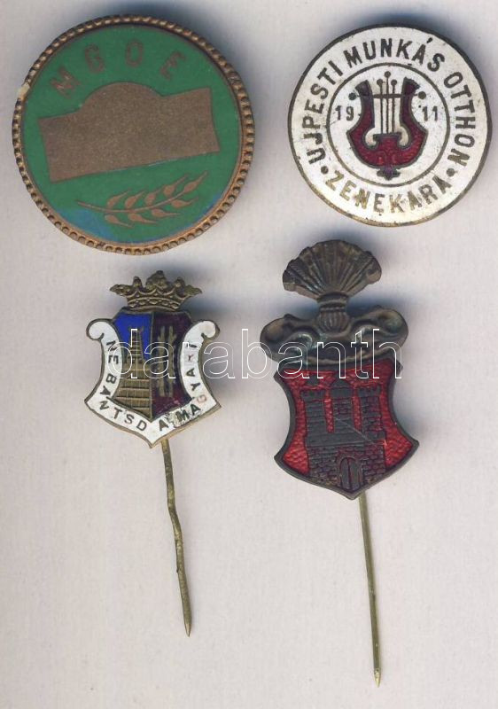 Leírás: 1911. "Újpesti Munkás Otthon Zenekara" zománcozott kitűző T:2-(letört a tű) + DN "Ne bántsd a magyart" zománcozott kitűző T:3+ + 2db különféle zománcozott kitűző T:2