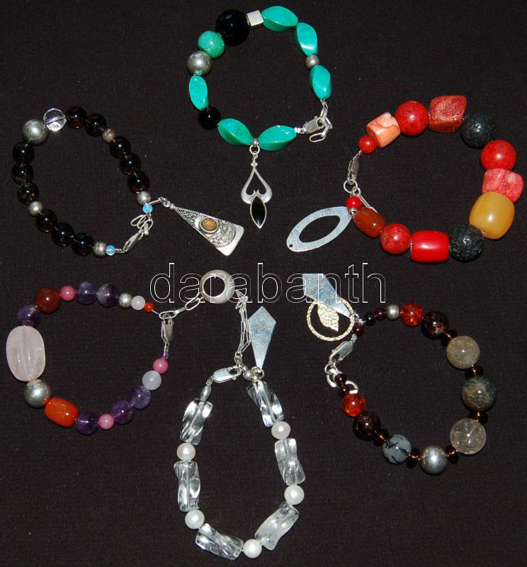 Leírás: 6 db féldrágakő karlánc ezüst (Ag) szerelékkel és díszítéssel: korall, hegyikristály, ametiszt, karneol, stb.
