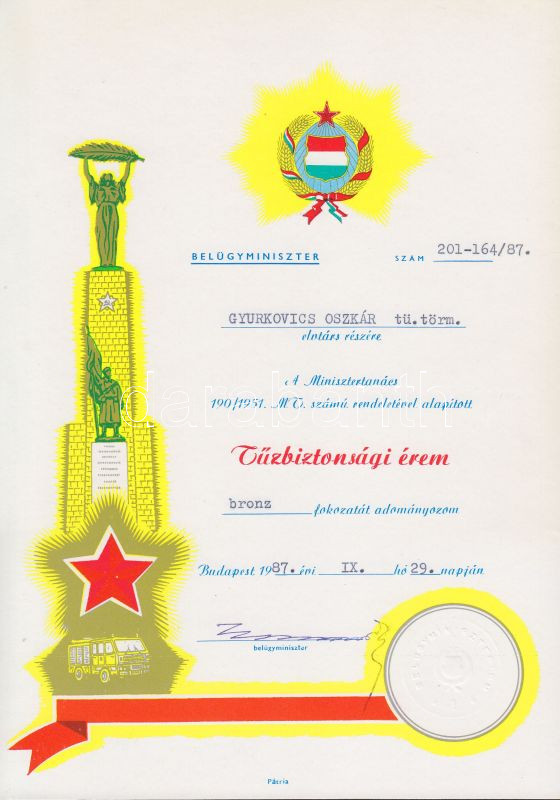 1987 Tűzbiztonsági érem oklevele és igazolványa Horváth István belügym... https://www.darabanth.com/hu/140-Gyorsarveres/140.0/Numizmatika/Numizmatikaval-Kapcsolatos-Dokumentaciok-Levelek~10004/1987-Tuzbiztonsagi-erem-oklevele-es-igazolvanya-Horvath-Istvan-belugyminiszter-sajat-kezu-~II400606