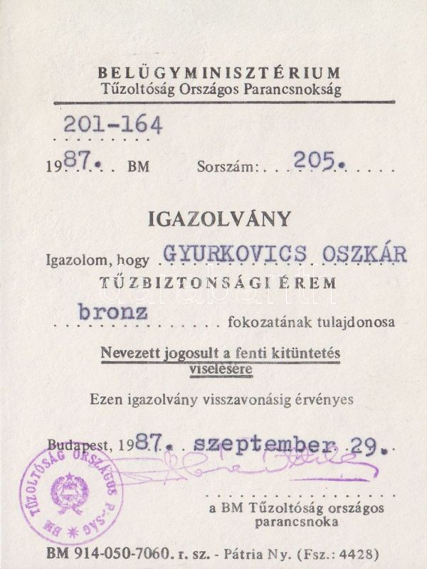 Leírás: 1987 Tűzbiztonsági érem oklevele és igazolványa Horváth István belügyminiszter saját kezű aláírásával
