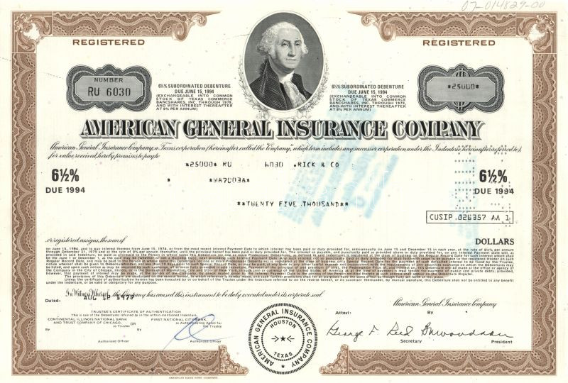 Leírás: USA / Texas 1977. American General Insurance Company általános biztosító részvénye T:II