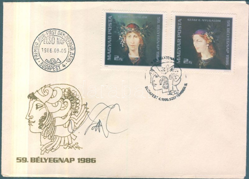 Leírás: 1986 Bélyegnap FDC, rajta a tervező Szász Endre saját kezű aláírásával