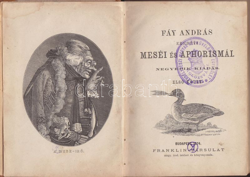 Fáy András: Eredeti meséi és aphorismái I. kötet Bp., 1874, Franklin. ... https://www.darabanth.com/hu/141-Gyorsarveres/141.0/Festmeny-mutargy-papirregiseg-egyeb/Konyvek-Egyeb-ritkasagok~20021/Fay-Andras-Eredeti-mesei-es-aphorismai-I-kotet-Bp-1874-Franklin-EMKE-felbor-kotesben~II419776
