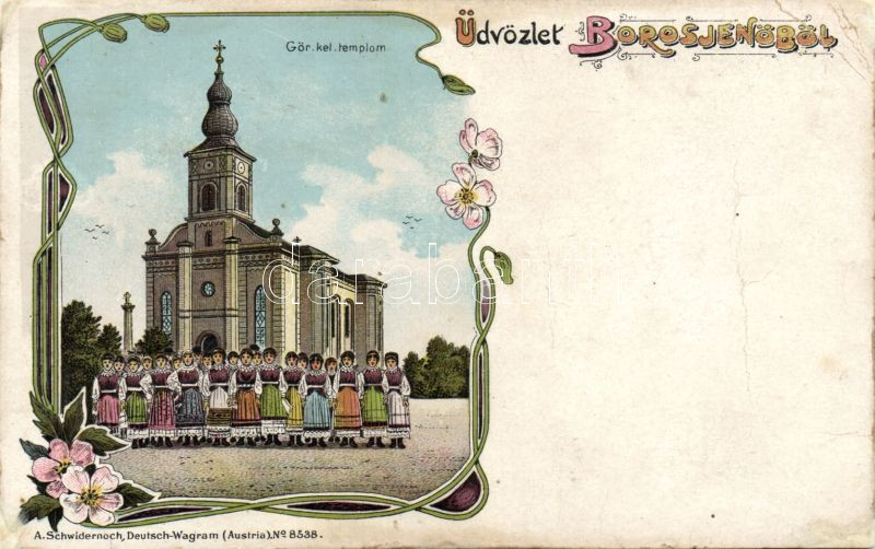 Leírás: Borosjenő Greek Catholic church, folklore litho (EB)