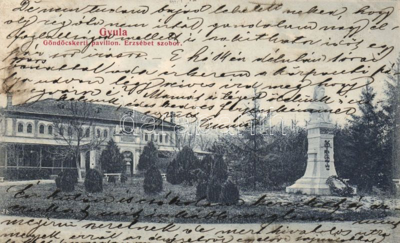 Gyula Göndöcskerti pavilon, Erzsébet-szobor https://www.darabanth.com/hu/141-Gyorsarveres/141.0/Kepeslapok/Magyarorszag~139/Gyula-Gondocskerti-pavilon-Erzsebet-szobor~II418149