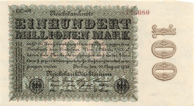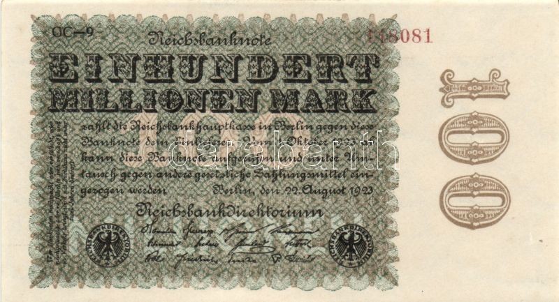 Német Birodalom / Weimari Köztársaság 1923. 100.000.000M (2x) cégnyomat "Sterne mit einem S darin" vízjellel, egymás utáni sorszámokkal T:I,I- + 1929. 10M "békenyomat" T:III