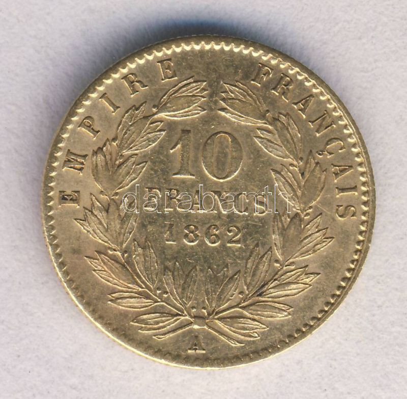 Franciaország/II.Császárság/III.Napóleon 1862A 10Fr Au 3,23g T:1- https://www.darabanth.com/hu/141-Gyorsarveres/141.0/Numizmatika/Magyar-es-kulfoldi-arany-penzek~10011/FranciaorszagIICsaszarsagIIINapoleon-1862A-10Fr-Au-3-23g-T1-~II418636