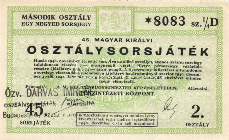 1940. "45. Magyar Királyi Osztálysorsjáték" második osztály egy negyed... https://www.darabanth.com/hu/141-Gyorsarveres/141.0/Numizmatika/Reszvenyek-Ertekpapirok-Sorsjegyek~10006/1940-45-Magyar-Kiralyi-Osztalysorsjatek-masodik-osztaly-egy-negyed-sorsjegye-TI~II404077