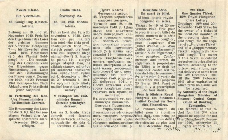 Leírás: 1940. "45. Magyar Királyi Osztálysorsjáték" második osztály egy negyed sorsjegye T:I