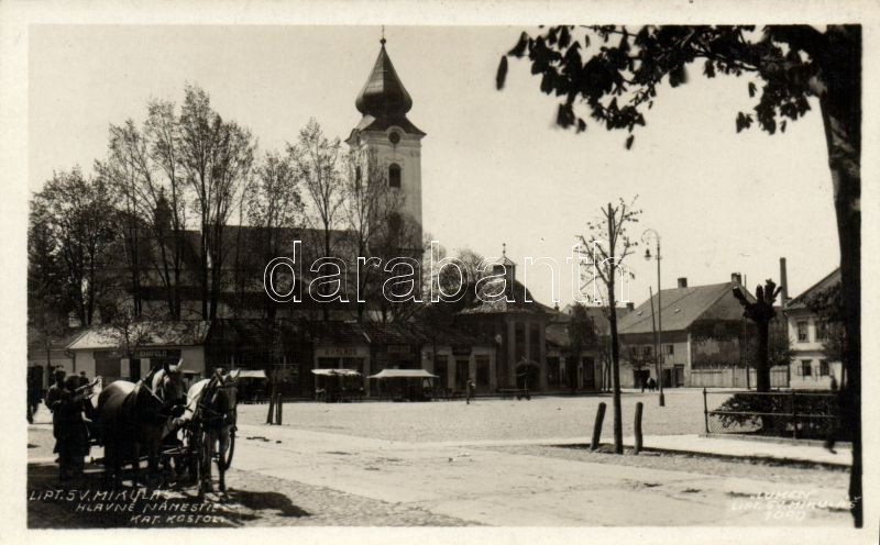 Leírás: Liptószentmiklós main square Catholic church and shops