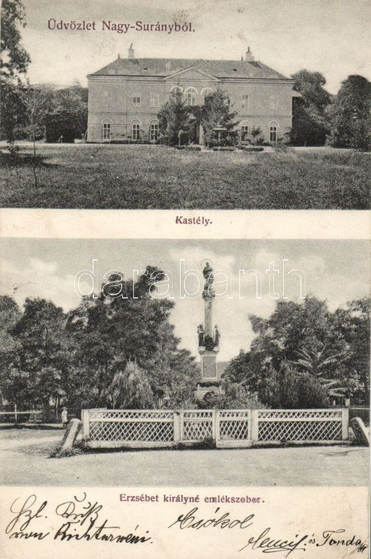 Nagysurány castle and Erzsébet statue (EK) https://www.darabanth.com/hu/142-Gyorsarveres/142.0/Kepeslapok/Felvidek~500007/Nagysurany-castle-and-Erzsebet-statue-EK~II421588