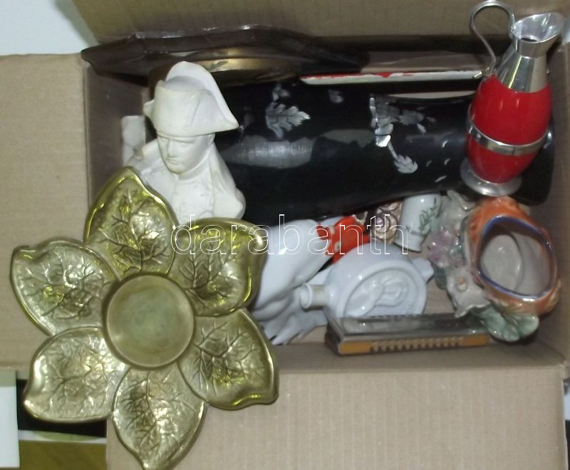 Leírás: Vegyes bolhapiac tétel: porcelán váza, kis kancsó, tál, fali díszplakett, szájharmónika, egyszálas váza, kis gipsz mellszobor, fém tábla, stb.