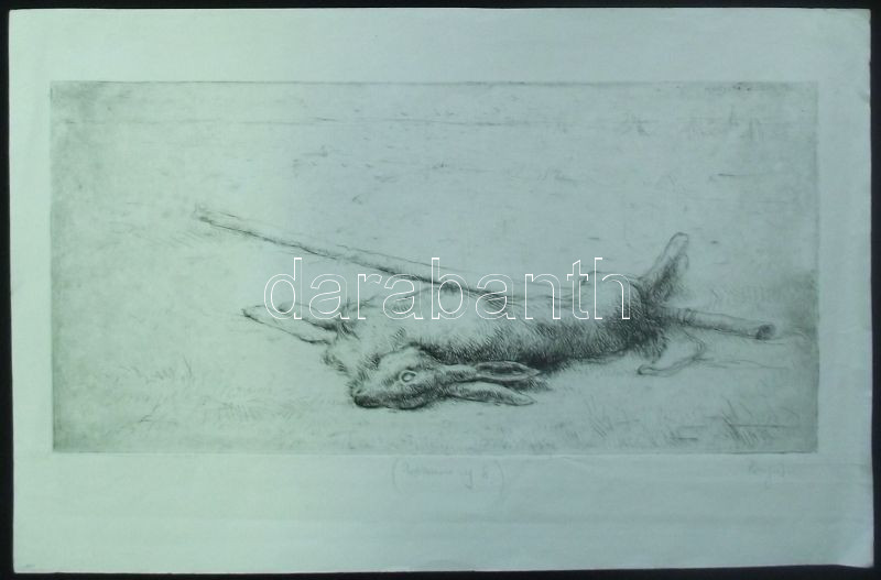 Leírás: Komjáti Wanyerka Gyula (1894-1958): Nyúltetem rézkarc-papír, jelzett, 20x32 cm
