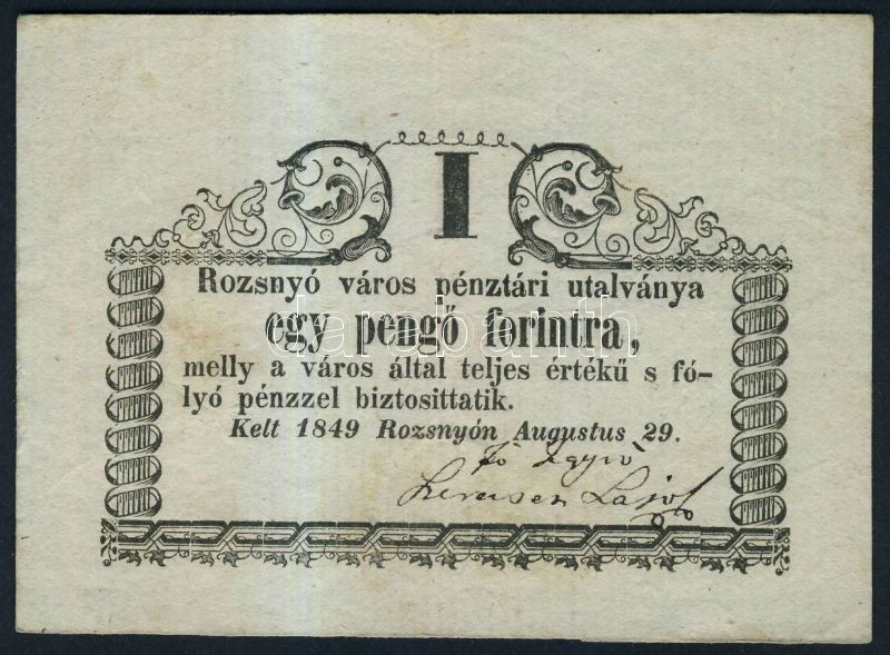 https://www.darabanth.com/hu/144-Gyorsarveres/144.0/Numizmatika/Magyar-es-kulfoldi-papir-es-fem-szuksegpenzek-penzhelyettesitok-~1000087/1849-Rozsnyo-1Ft-TII-~II429623