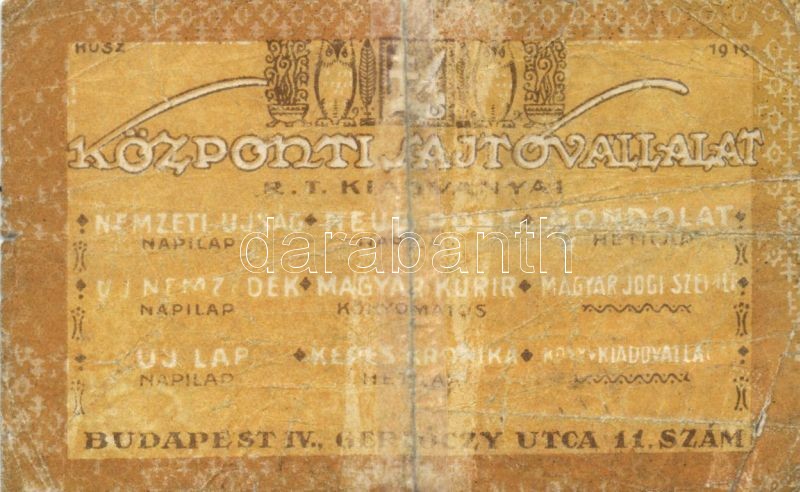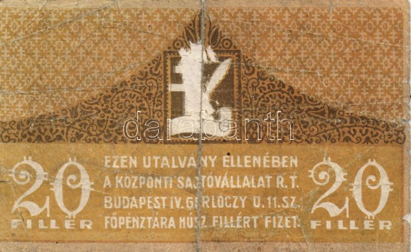 Budapest 1919. "Központi Sajtóvállalat" 20f + Pécs 1919. 10f + Kenyérm... https://www.darabanth.com/hu/144-Gyorsarveres/144.0/Numizmatika/Magyar-es-kulfoldi-papir-es-fem-szuksegpenzek-penzhelyettesitok-~1000087/Budapest-1919-Kozponti-Sajtovallalat-20f-plus-Pecs-1919-10f-plus-Kenyermezohadifogolytabor-191~II429995