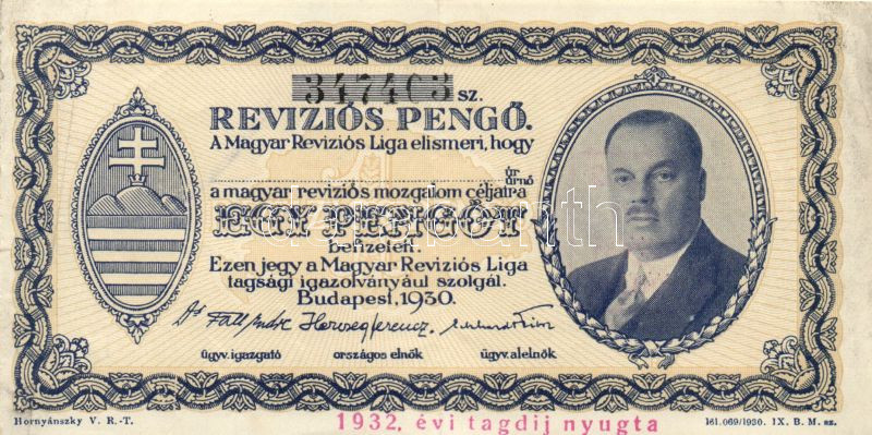 Leírás: Budapest 1930. "Reviziós pengő" arcképes változat T:III