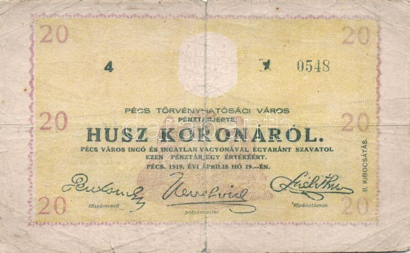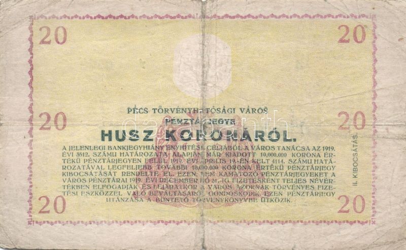 Leírás: Pécs 1919. április 19. II.kiadás Pénztárjegy 20K-ról, szárazbélyegzővel T:III-