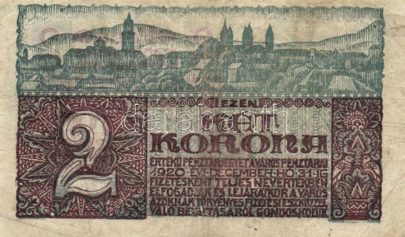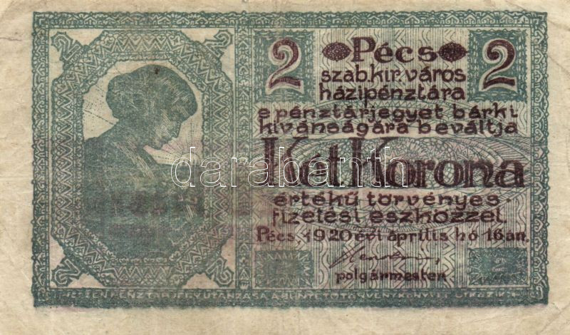 Pécs 1920. 2K pénztárjegy T:III https://www.darabanth.com/hu/144-Gyorsarveres/144.0/Numizmatika/Magyar-es-kulfoldi-papir-es-fem-szuksegpenzek-penzhelyettesitok-~1000087/Pecs-1920-2K-penztarjegy-TIII~II429941