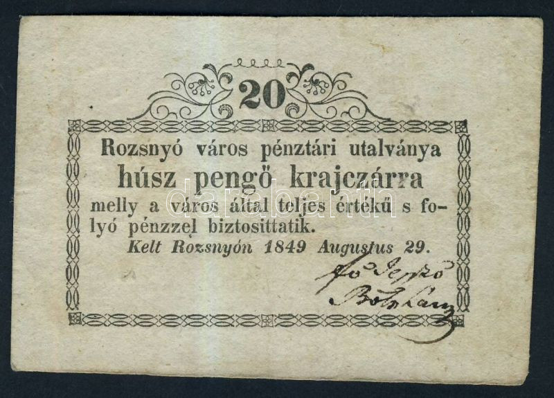 Rozsnyó 1849. 20kr T:III+ https://www.darabanth.com/hu/144-Gyorsarveres/144.0/Numizmatika/Magyar-es-kulfoldi-papir-es-fem-szuksegpenzek-penzhelyettesitok-~1000087/Rozsnyo-1849-20kr-TIIIplus~II429633