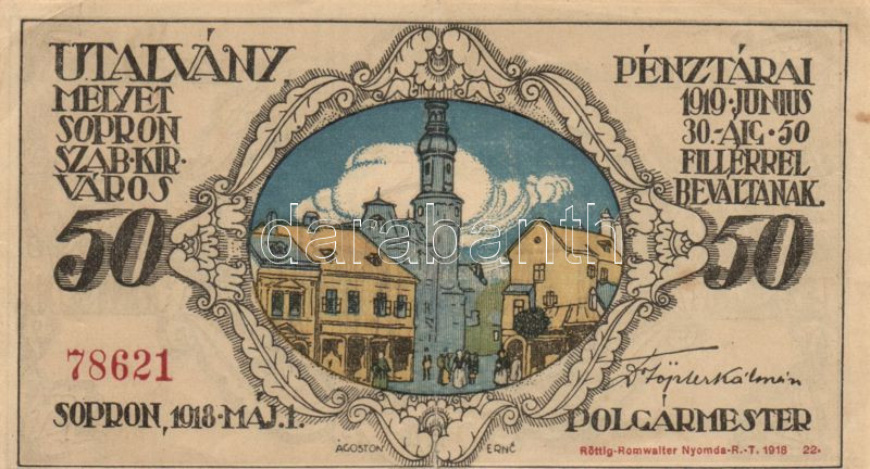Leírás: Sopron 1918. május 1. 50f utalvány T:II hajtásnál szakadás