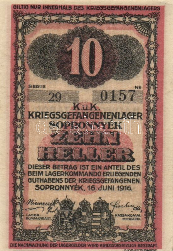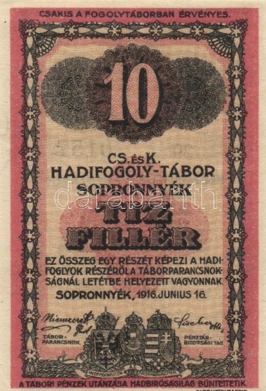 Sopronnyék/hadifogolytábor 1916. június 16. 10f T:I https://www.darabanth.com/hu/144-Gyorsarveres/144.0/Numizmatika/Magyar-es-kulfoldi-papir-es-fem-szuksegpenzek-penzhelyettesitok-~1000087/Sopronnyekhadifogolytabor-1916-junius-16-10f-TI~II427684