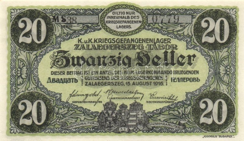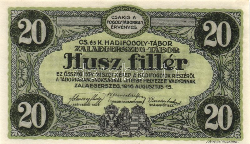 Zalaegerszeg/hadifogolytábor 1916. augusztus 15. 20f T:I https://www.darabanth.com/hu/144-Gyorsarveres/144.0/Numizmatika/Magyar-es-kulfoldi-papir-es-fem-szuksegpenzek-penzhelyettesitok-~1000087/Zalaegerszeghadifogolytabor-1916-augusztus-15-20f-TI~II427691