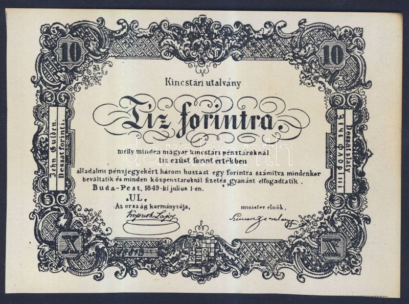 Leírás: 1849. 10Ft "Kincstári utalvány" 1964-es utánnyomata "Hazafias Népfront XXI. ker. Bizottsága 1848-1849-es Szabadságharci Emlékkiállítása Csepel, 1964. III.15." T:I
