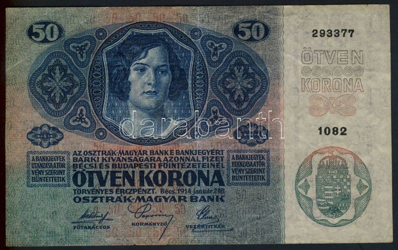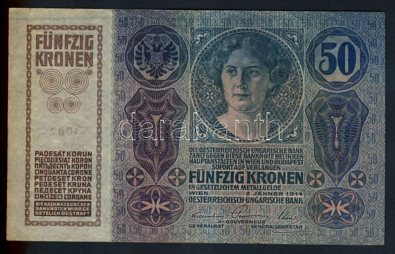 Leírás: 1914. 50K főtípus, felülbélyegzés nélkül T:III-(kis szakadás)