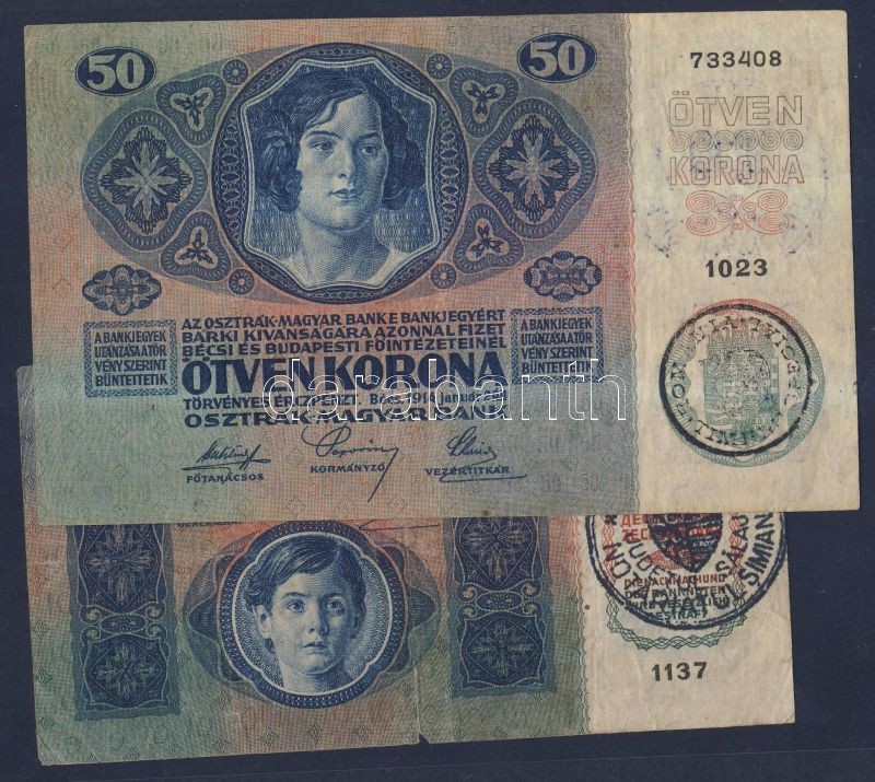 1914. 50K + 1915. 10K mindkettő román hamis körbélyegzővel T:III https://www.darabanth.com/hu/144-Gyorsarveres/144.0/Numizmatika/Magyar-es-magyar-vonatkozasu-bankjegyek~1000088/1914-50K-plus-1915-10K-mindketto-roman-hamis-korbelyegzovel-TIII~II430467