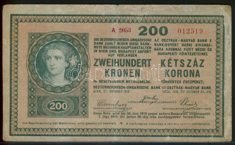 1918. 200K "A2053" hullámos hátlap T:III(hátlapon ragasztás) https://www.darabanth.com/hu/144-Gyorsarveres/144.0/Numizmatika/Magyar-es-magyar-vonatkozasu-bankjegyek~1000088/1918-200K-A2053-hullamos-hatlap-TIIIhatlapon-ragasztas~II429886