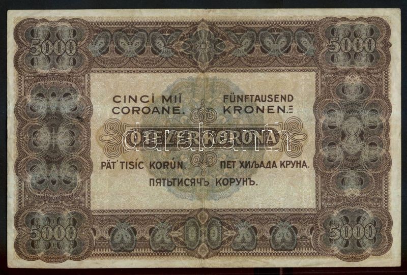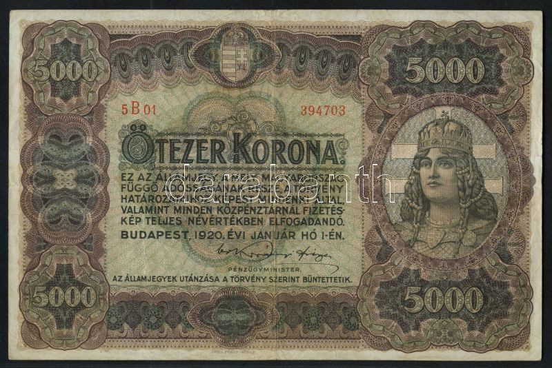 1920. 5000K "5 B 01" T:III(kis beszakadás) https://www.darabanth.com/hu/144-Gyorsarveres/144.0/Numizmatika/Magyar-es-magyar-vonatkozasu-bankjegyek~1000088/1920-5000K-5-B-01-TIIIkis-beszakadas~II429923