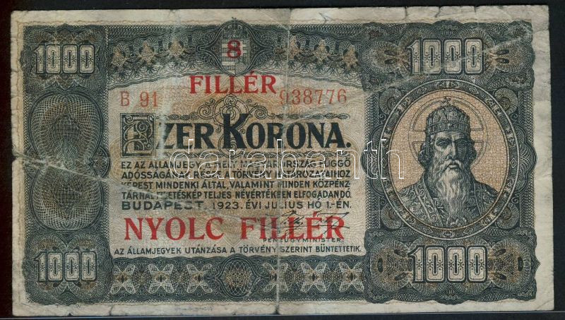 1923. 1000K "8 FILLÉR NYOLC FILLÉR" felülbélyegzéssel T:IV https://www.darabanth.com/hu/144-Gyorsarveres/144.0/Numizmatika/Magyar-es-magyar-vonatkozasu-bankjegyek~1000088/1923-1000K-8-FILLER-NYOLC-FILLER-felulbelyegzessel-TIV~II429915