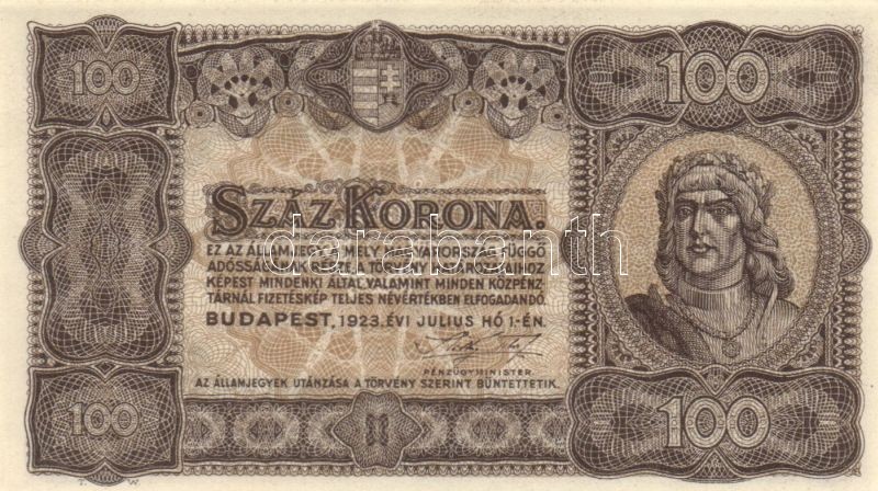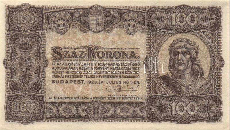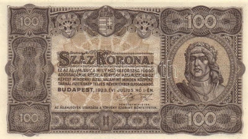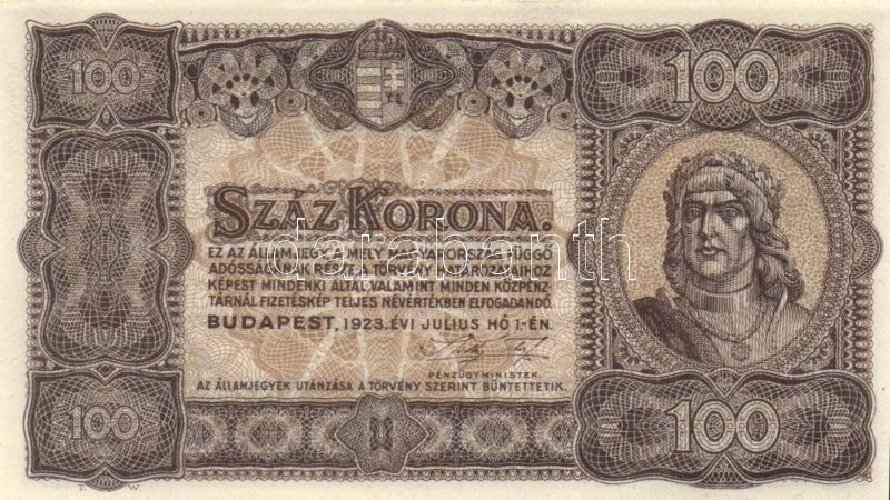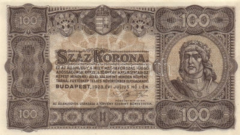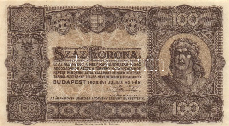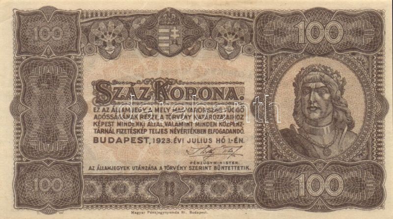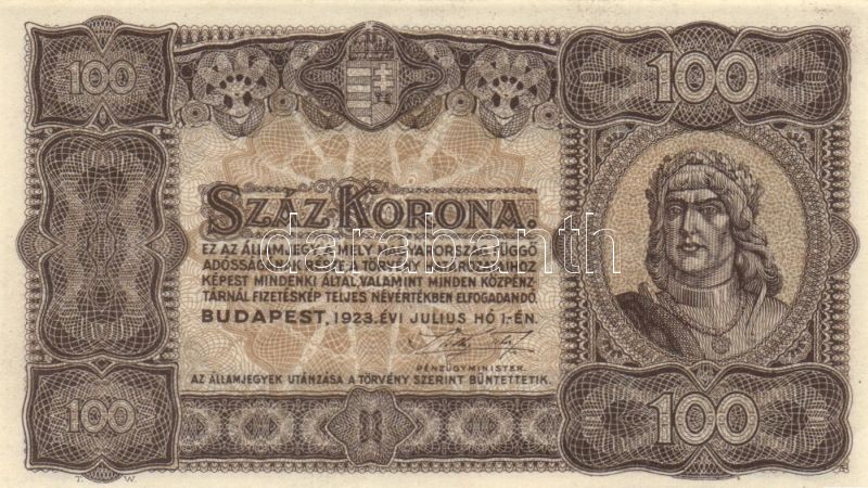 Leírás: 1923. 100K ebből "T.W" (7x) és "Magyar Pénzjegynyomda Rt." (2x) T:I