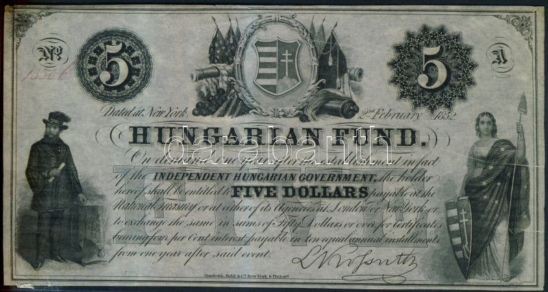 Leírás: Emigrációs Kossuth-bankó 1852. 5$ "A" piros sorszámmal, papírránccal T:II apró lyuk jobb felső saroknál