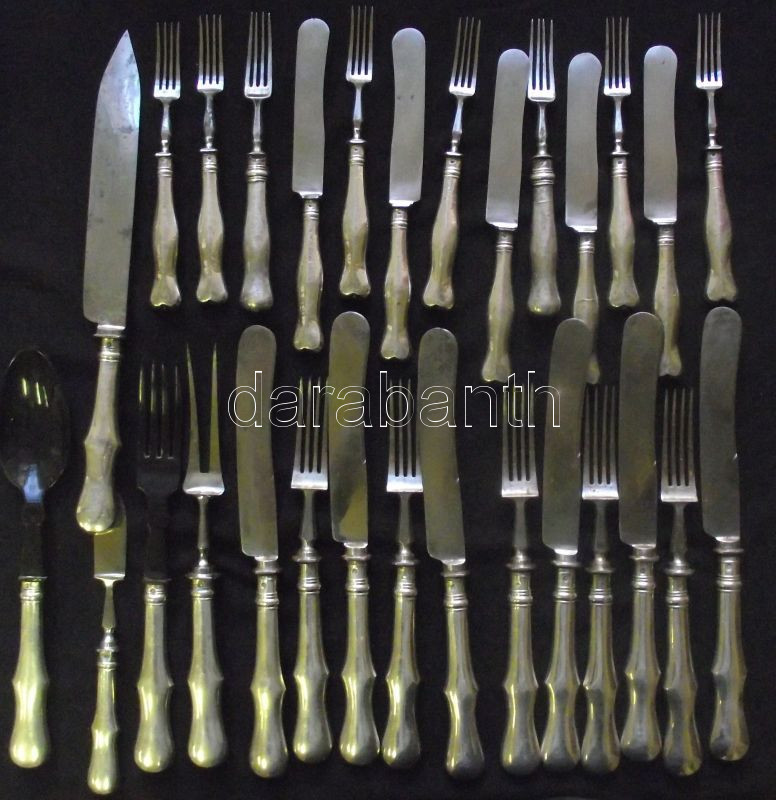 Leírás: Ezüst nyelű jelzett kétféle étkészlet (hiányos), összesen (Br.: 1630g) / silver-handled cuttlery(missing pieces)