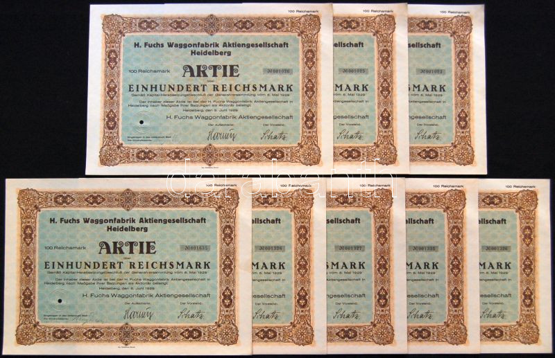 Leírás: Heidelberg 1929. "H.Fuchs Vagongyár" részvénye 100M-ról (8x) T:I-