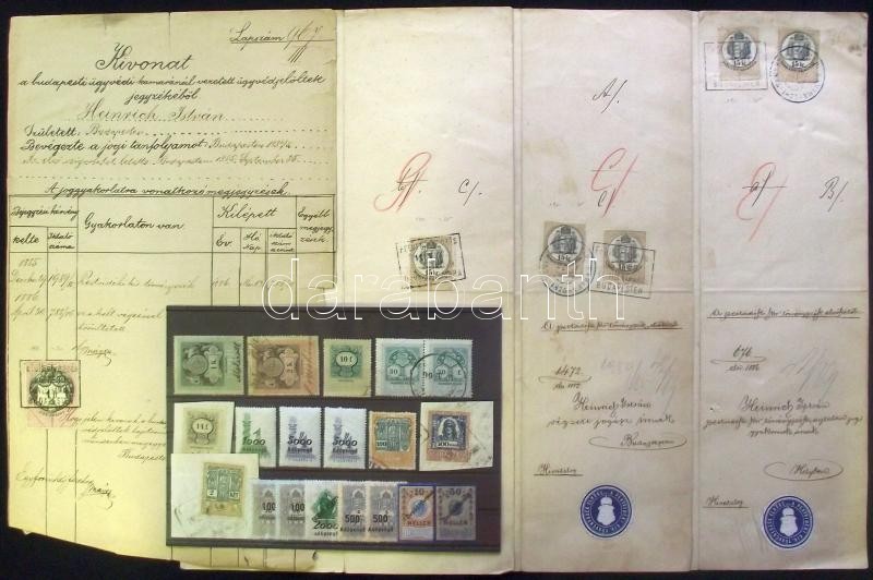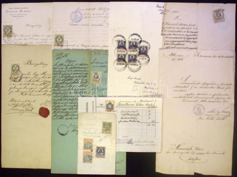 Leírás: 19 db okmánybélyeg + további 18 db okmányokon