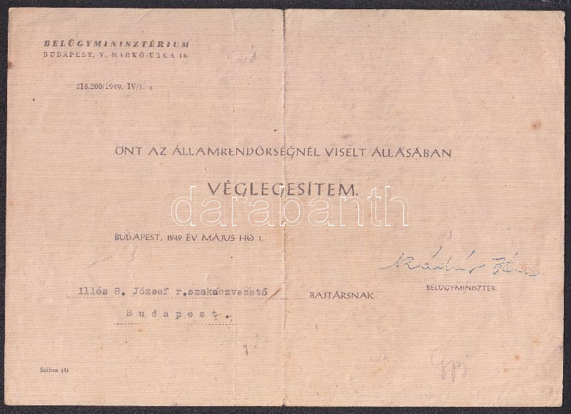 Leírás: 1949 Rendőri véglegesítési igazolás pecsételt Kádár aláírással