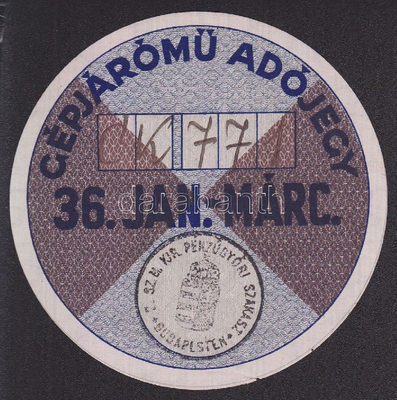1936 Gépjárómű adójegy / car due stamp https://www.darabanth.com/hu/145-Gyorsarveres/145.0/Festmeny-mutargy-papirregiseg-egyeb/Parafilatelia~199/1936-Gepjaromu-adojegy-car-due-stamp~II436428